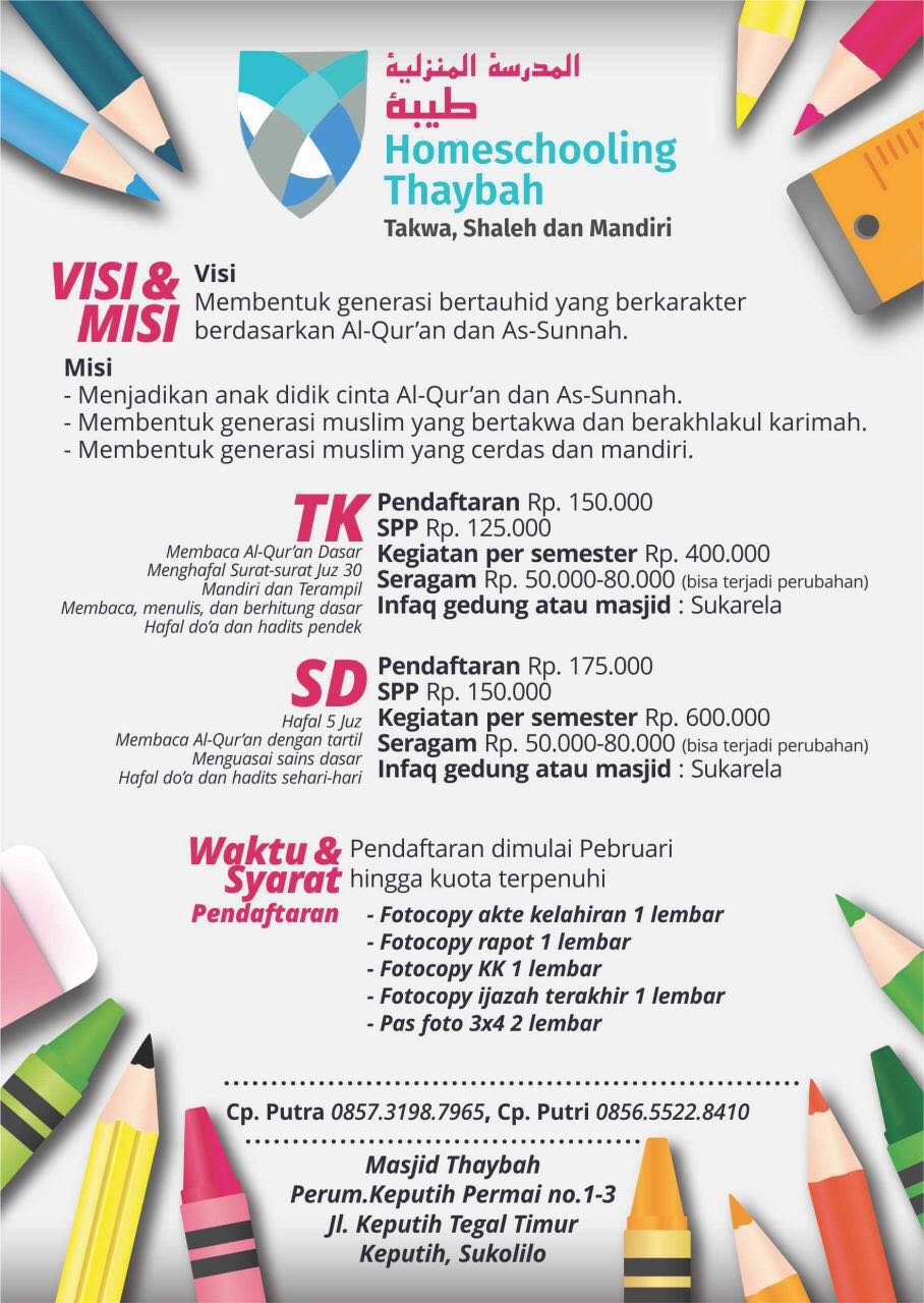 PKBM Thoybah yang beralamatkan di komplek Pesantren mahasiswa dan masjid Thaybah Perum keputih Permai no. 1-3 jl. Keputih tegal Timur – Keputih – Sukolilo – Surabaya kembali membuka pendaftaran peserta didik baru tahun ajaran 2017-2018.