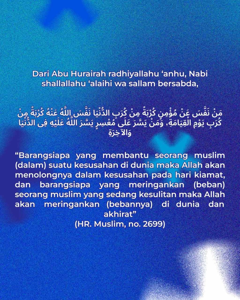 “Barangsiapa yang membantu seorang muslim (dalam) suatu kesusahan di dunia maka Allah akan menolongnya dalam kesusahan pada hari kiamat, dan barangsiapa yang meringankan (beban) seorang muslim yang sedang kesulitan maka Allah akan meringankan (bebannya) di dunia dan akhirat” (HR. Muslim, no. 2699)